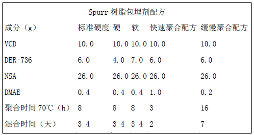 這是1969年由Spurr推薦使用的包埋劑,所以也稱Spurr樹脂。它含有兩個環(huán)氧基,是一種低粘度(25℃時,7-10cP)的環(huán)氧樹脂。由于具有粘度低的特點,所以近年來一些實驗室已開始使用它。其配方可按下表中各種成分的比例,即可獲得不同性能的包埋塊。其配方如下: