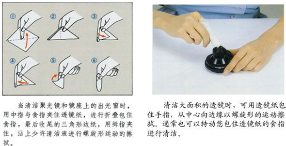 ??? 最好先用吹氣球或者吹氣槍先吹掉表面大的塵土顆粒,結(jié)合軟毛刷輕輕吹刷,因?yàn)檫@些顆粒往往容易劃傷鍍膜層,然后再用擦鏡紙醮取清潔液進(jìn)行擦拭??蓞⒖既缦聢D例所示方法: