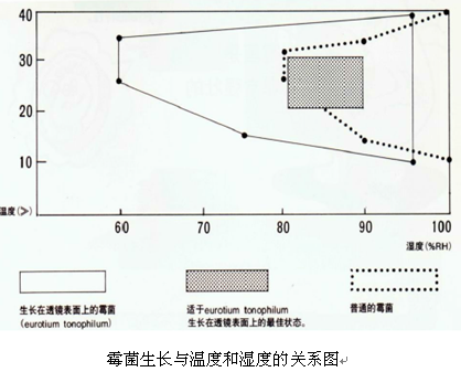 ??? 顯微鏡的光學(xué)表面都有防霉系統(tǒng),各個(gè)廠家都是采用化學(xué)藥品鍍膜防霉,一般有效期大約在7-8 年左右,超過8 年以后,防霉系統(tǒng)會(huì)失效,此時(shí),應(yīng)該找顯微鏡廠家重新安置防霉片,否則,實(shí)驗(yàn)室條件差的顯微鏡會(huì)開始長(zhǎng)霉,南方潮濕地區(qū)特別顯著,霉菌會(huì)分泌有害物質(zhì)腐蝕玻璃表層的鍍膜層,霉菌密度大時(shí)危害特別大,這樣會(huì)嚴(yán)重危害顯微鏡的光學(xué)性能,因?yàn)殄兡邮枪鈱W(xué)顯微鏡性能的關(guān)鍵所在。上圖是霉菌生長(zhǎng)與溫度和濕度的關(guān)系圖(僅供參考)。
