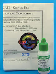納米級(jí)微球顆粒標(biāo)準(zhǔn)品(Particle-Size Standards)直徑大小高度均一,具有NBS 的NIST認(rèn)證,屬于Duke Scientific公司榮譽(yù)出品Nanosphere Size Standards™系列產(chǎn)品中的聚合體微球標(biāo)準(zhǔn)品(苯乙烯單體聚合而成)。