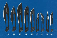 顯微外科解剖刀片,無菌獨立包裝,共有九種不同樣式,從右往左依次為1011、12、15、20、21、2223、24、25號,滿足您不同的實驗操作,訂購時需要指明幾號刀片。
