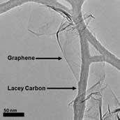 A typical TEM image of graphene sheets freely suspended on a lacey carbon TEM grid.