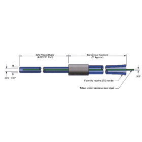 該導(dǎo)管系統(tǒng)提供最小直徑導(dǎo)管 /管芯產(chǎn)品,適用于小鼠和其它小型研究動物的心血管、顱內(nèi)實(shí)驗應(yīng)用。32G小鼠顱內(nèi)導(dǎo)管構(gòu)造圖見下,前端也是主要部分長11.7cm,尺寸32G 的聚氨酯導(dǎo)管(0.010英寸O.D./ 0.005英寸 I.D.);緊接著后段是過渡連接區(qū)域長大約7.6cm,其末端膨大為喇叭形連接口(可配套27 G 針);整個導(dǎo)管內(nèi)有一條直徑 0.003英寸 的特氟龍材料包被的不銹鋼針(鈍頭針)。該導(dǎo)管系統(tǒng)獨(dú)立包裝。