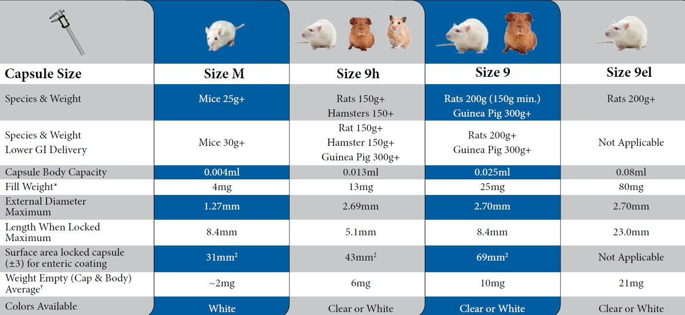 小動(dòng)物專用膠囊根據(jù)使用對(duì)象的個(gè)體大小分為四個(gè)級(jí)別:9el號(hào)、9號(hào)、9H和M號(hào)。9號(hào)適用于大鼠(體重150g以上)和豚鼠;M號(hào)適用于體重大于30g的小鼠。另外,9號(hào)還適用于大鼠(200g-250g)的肛腸給藥(是不是也要考慮包衣問題?)??紤]到9el號(hào)膠囊太大,不適合腸溶,就不給出包衣的指導(dǎo)面積了。