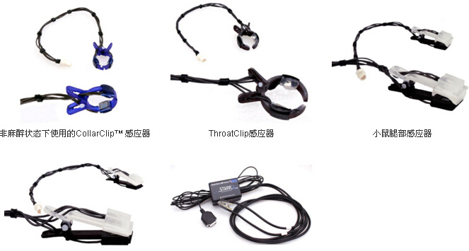 MouseOx Plus也即設備盒子,單獨這個設備并不能順利開展工作,除去必備的電腦之外,傳感器(sensor clip)是必須選擇的配件。傳感器一般通過通用纜線(Universal Cable與設備盒子連接。可根據(jù)實驗對象來選擇夾持在動物的不同體位的傳感器。