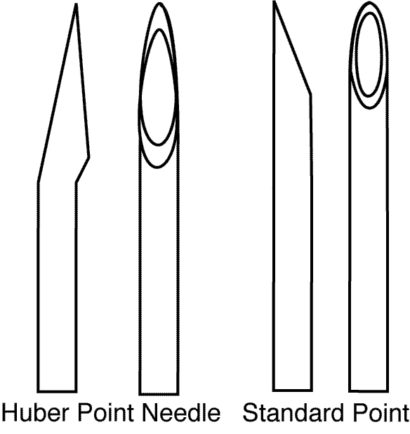提倡用此針配套植入式輸液港或者肝素帽使用,可以大大延長植入式輸液港或肝素帽的壽命。普通注射針和Huber注射針對(duì)植入式輸液港的隔膜進(jìn)行了穿刺落屑比對(duì)試驗(yàn),結(jié)果表明,采用Huber注射針穿刺后的落屑數(shù)均明顯少于普通注射針的試驗(yàn)結(jié)果(huber注射針又稱不落屑針)。這是因?yàn)?/span>Huber注射針的針尖采用了獨(dú)特的幾何形狀,防止或者減少了取芯作用(針頭穿過材料時(shí)一部分進(jìn)入到針尖附近腔中的現(xiàn)象)。